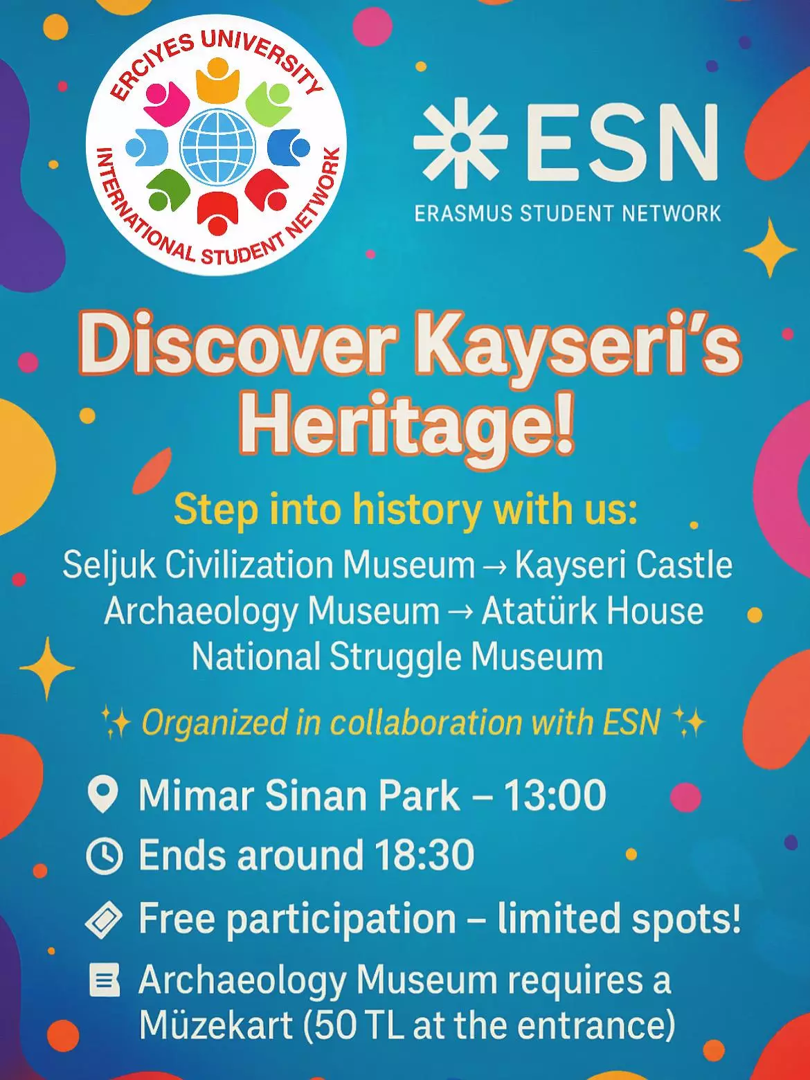 Uluslararası Öğrenci Ağı (ISN) ve Erasmus Student Network (ESN) iş birliğiyle düzenlenen kültür turu başarıyla gerçekleştirildi. Etkinlik, Selçuklu Uygarlığı Müzesi ziyaretiyle başladı; ardından Kayseri Kalesi, Kayseri Arkeoloji Müzesi, Atatürk Evi Müzesi ve Milli Mücadele Müzesi gezilerek tamamlandı.