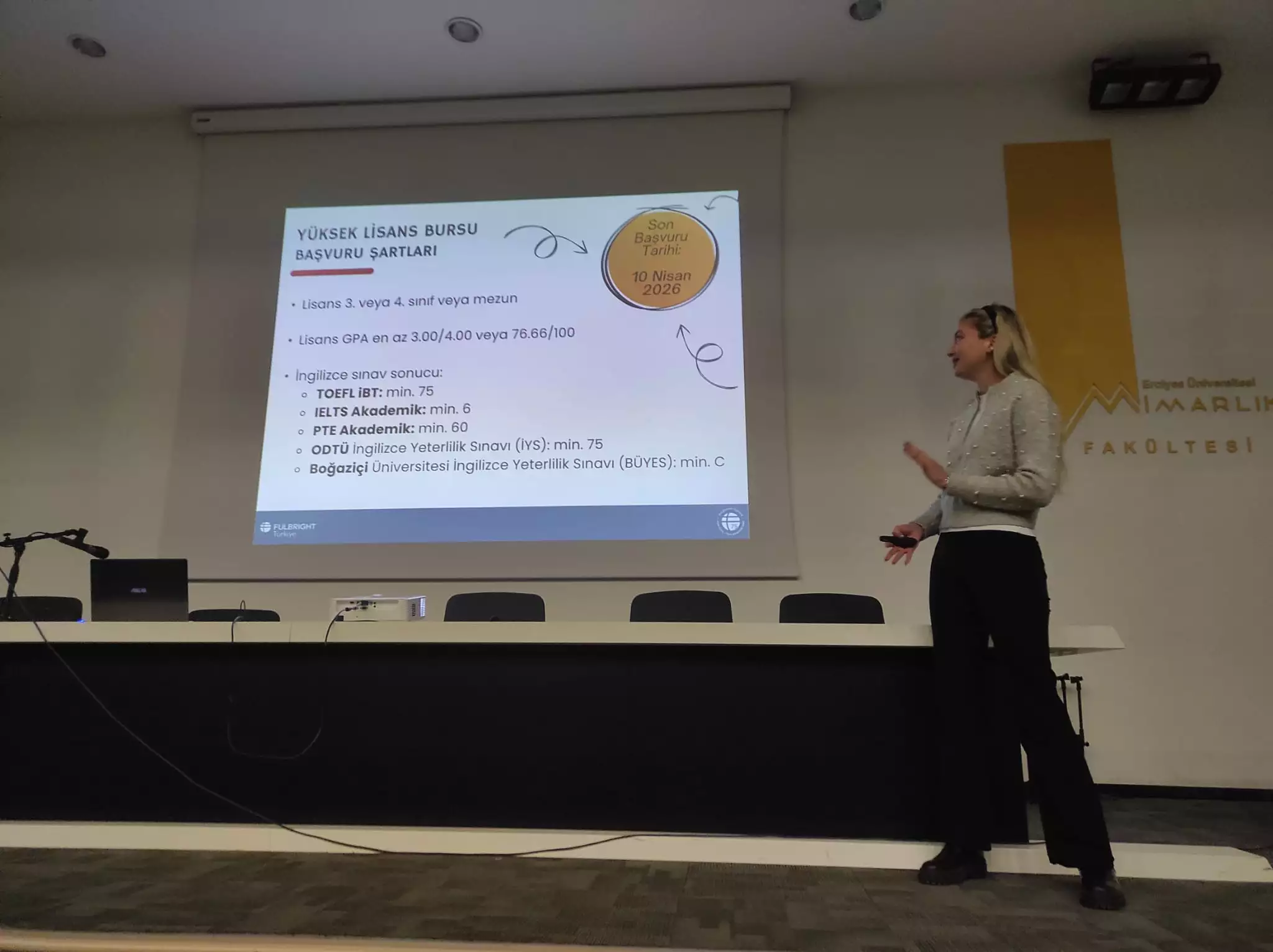 Türkiye Fulbright Eğitim Komisyonu ile iş birliğinde, öğrencilere ve akademisyenlere yönelik kapsamlı bir bilgilendirme etkinliği düzenledi. Mimarlık Fakültesi konferans salonunda gerçekleştirilen etkinlikte, ABD'de yüksek lisans, doktora ve araştırma olanakları, burs kapsamı ve başvuru süreçleri detaylandırıldı. Sunu sonrası eğitim danışmanı ile süreçlerle ilgili soru cevap gerçeklestirildi.